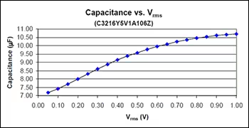 如果將測試儀表的OSC電壓設置為1.0Vrms,不能保證在電容器上施加全部外加電壓。因此,當發(fā)現(xiàn)電容器上的電壓約為設定值的10%時,也就不足為奇了(圖3)。該圖顯示了低VAC如何影響測得的電容值。