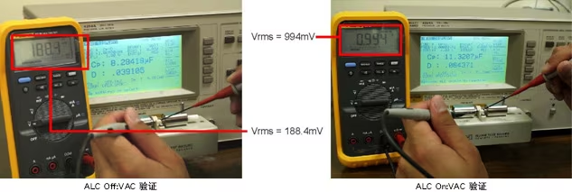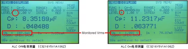 下圖展示了ALC on和off之間的差異。當ALC功能off時,電容器上的實際電壓約為1.0Vrms設定電壓的10%。當ALC功能on時,電容器上的電壓幾乎是設定電壓的100%。HP4284A具有電壓和電流等級監(jiān)視器,但還是可以使用伏特計驗證實際電壓。