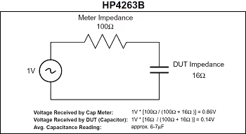 當從測試設備中將1.0 Vrms的電壓加到電容器時,電壓在儀表阻抗和電容器阻抗之間被分壓。對于HP4263B測試儀,其阻抗保持為100 Ω不變(圖1),而對于HP4278A測試儀,計算的電容器阻抗變?yōu)?.5 Ω(圖2)。結果表明,對于HP4263B測試儀,絕大多數(shù)外加電壓會降低在測試儀阻抗中,而HP4278A測試儀可以使電容器能夠接收大部分外加電壓。因此,HP4263B測試儀顯示的測量值將低于真實值。